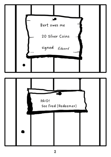 It uses the idea, apparently from ancient times, that when someone did not pay their debt it was posted on their door until it was paid. A redeemer was someone who had pity for the person and folded the paper in half, hiding the details of the debt and declared that they would pay the debt instead of the original debtor.