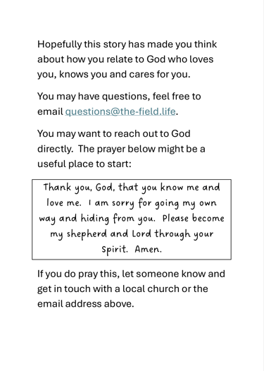 Hopefully this story has made you think about how you relate to God who loves you, knows you and cares for you.